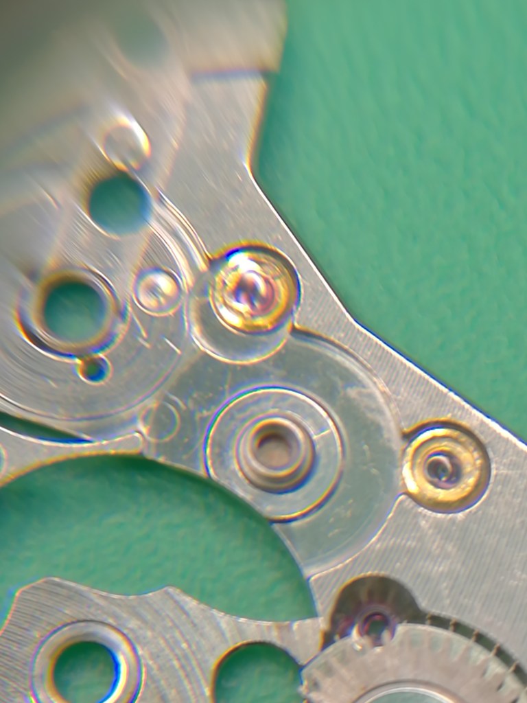 After cleaning the balance I put it back on the main plate to check if the spring is flat. It was not! Again the photo is done from my mobile + a 10x loupe on top of camera, so not picture perfect.