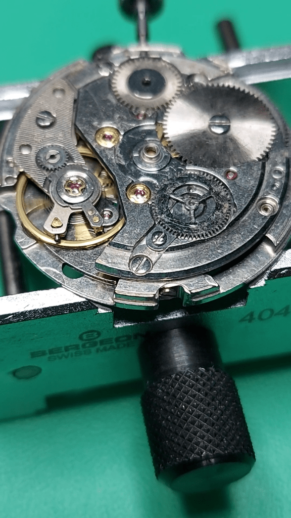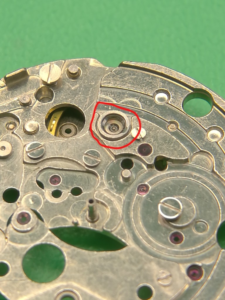 It is hard to see but the spring is tilted. When flipping the main plate over, see and behold, the cap jewel and it’s diashock spring is missing.